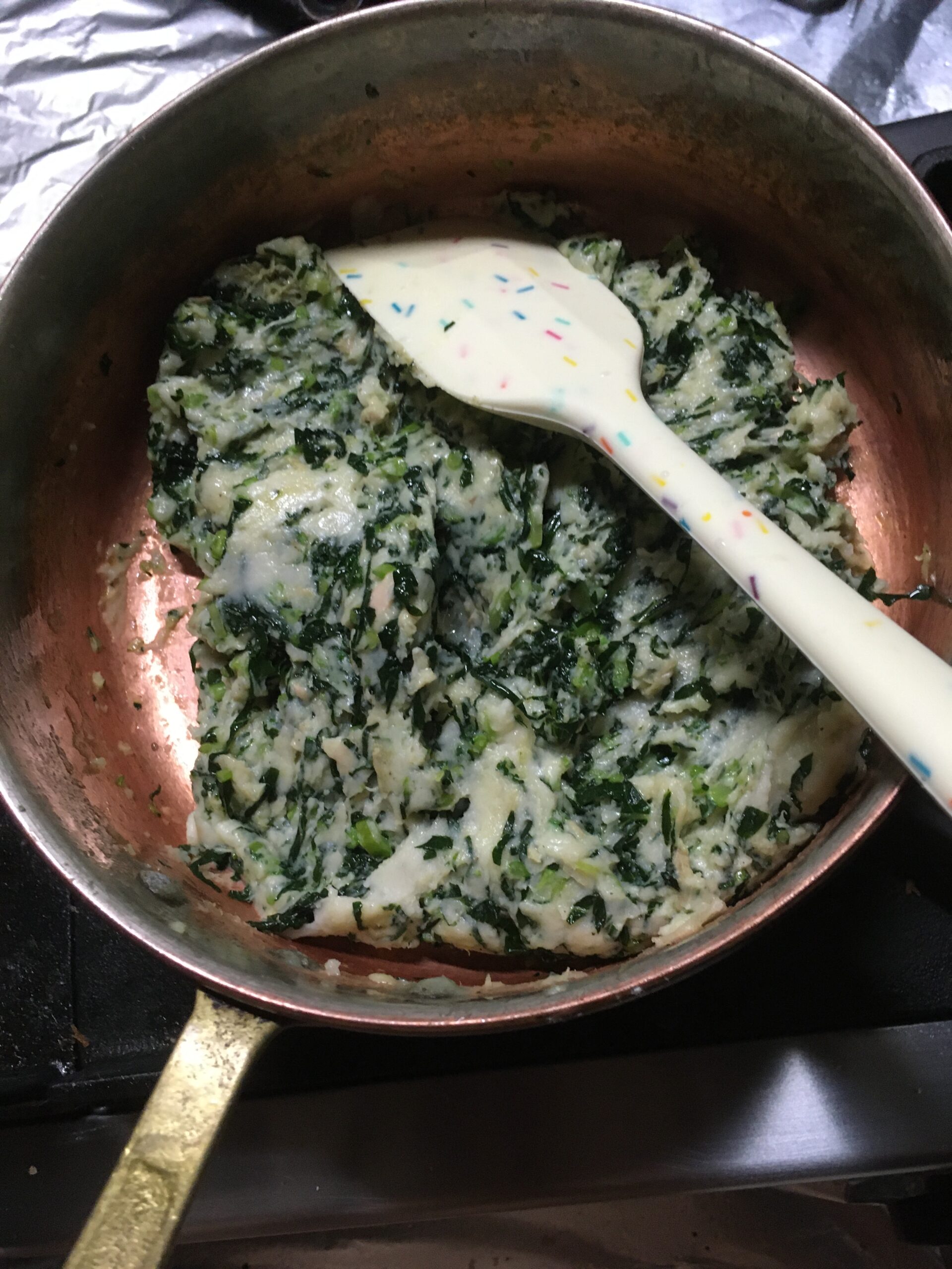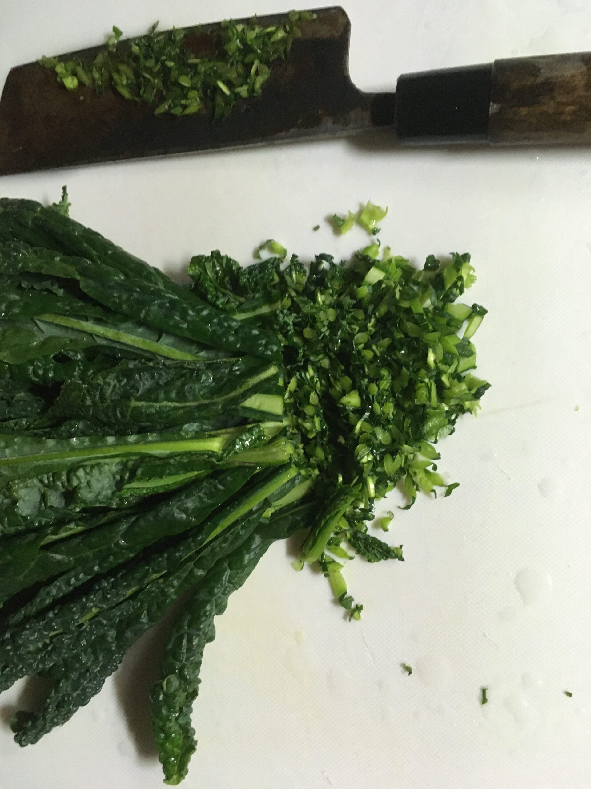 - カーヴォロネーロは太い中肋を取り除いて細かく千切りまたはみじん切りにし、植物油(分量外)を熱したフライパンでしんなりするまで中火で炒める