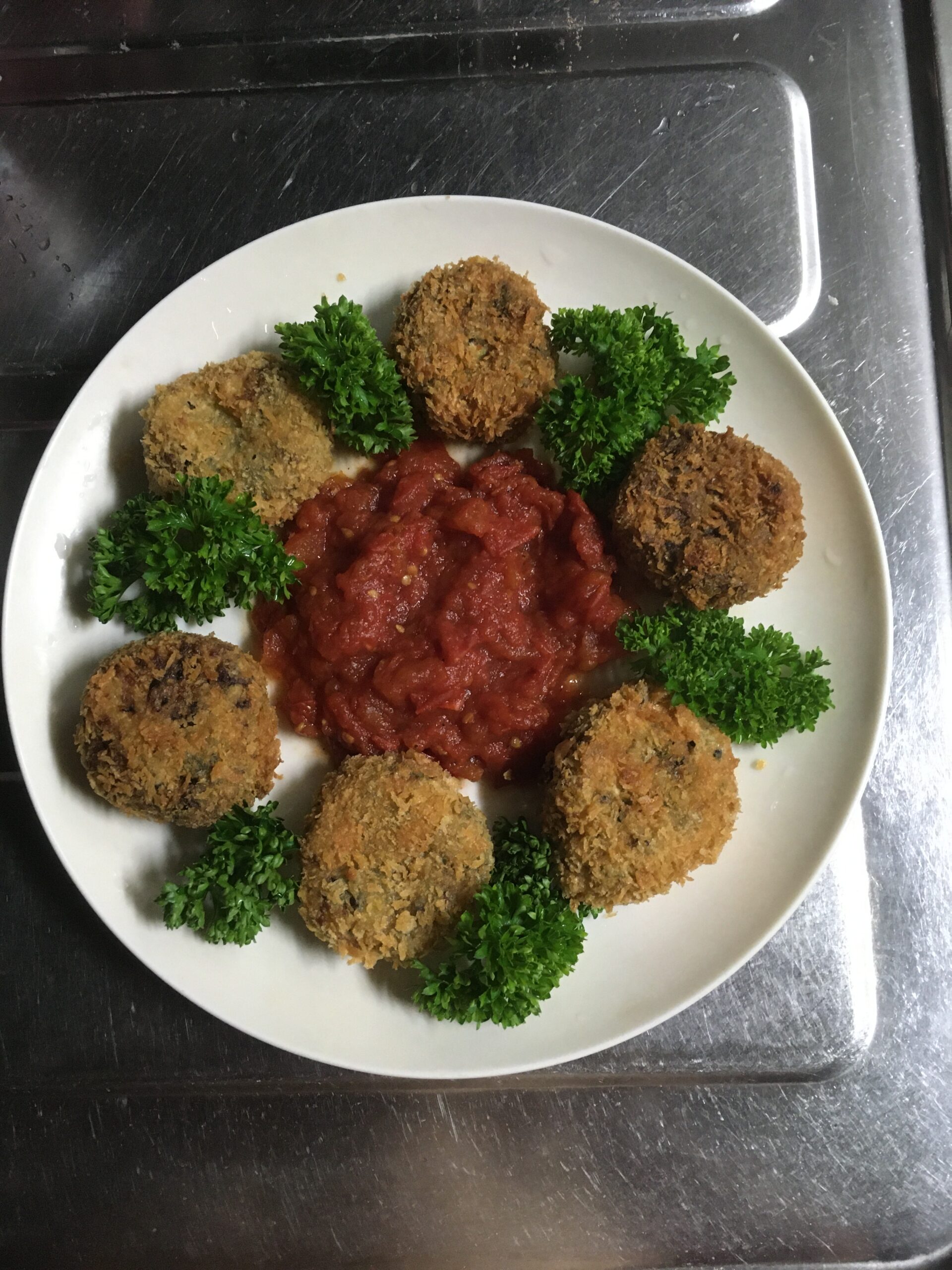 - スプーンを使って成形し、小麦粉・溶き卵・パン粉の順で衣をつけ、180~200℃に熱した油で色よく揚げる
