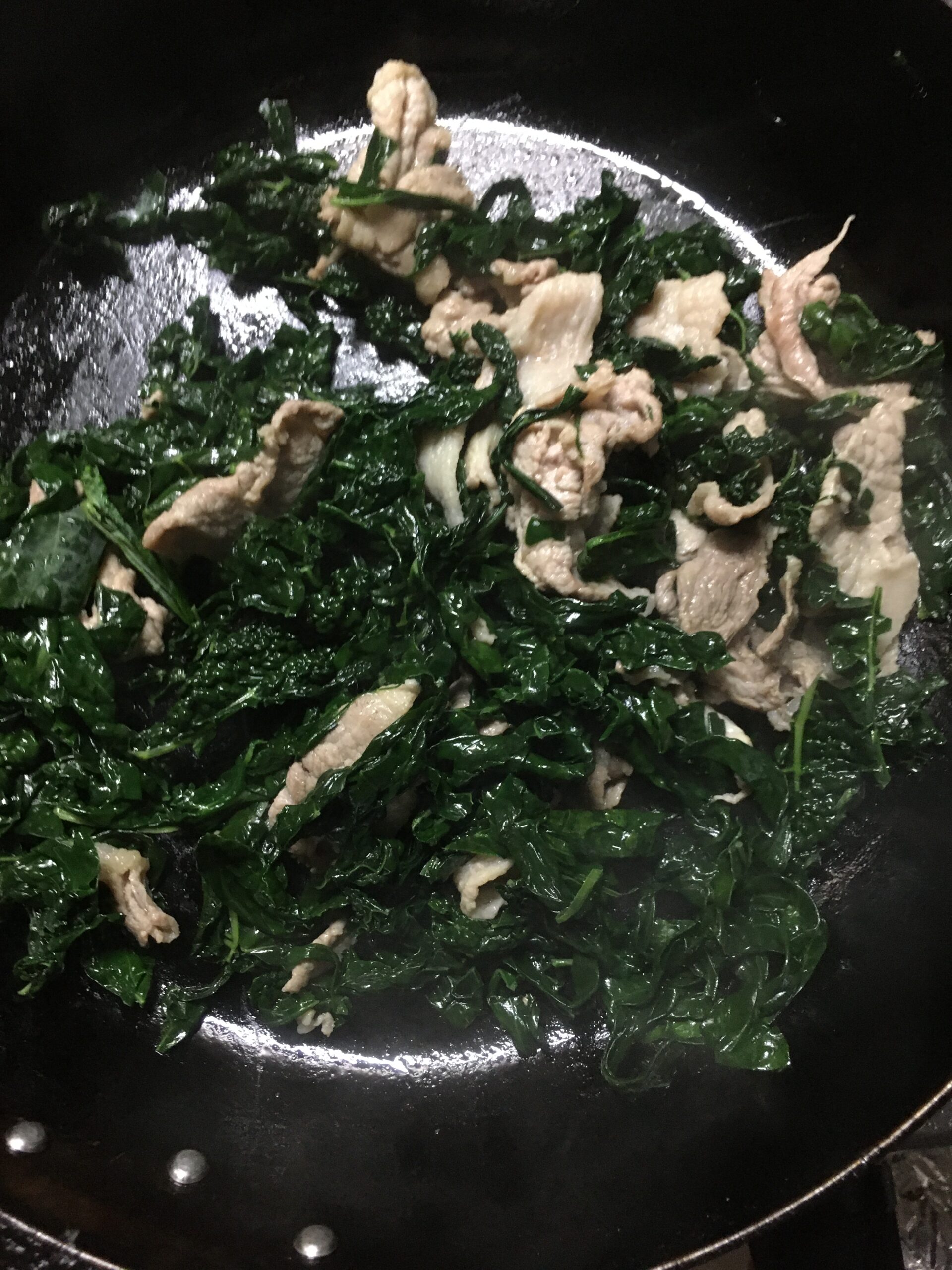 - フライパンに植物油(分量外)を熱し、豚こまとカーヴォロネーロをよく炒める。この段階で豚肉とカーヴォロネーロに完全に火を通すこと