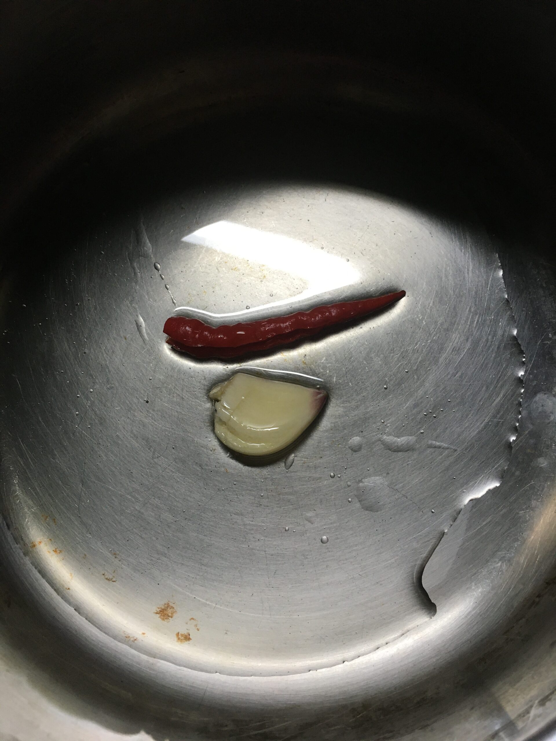 - フライパン(または中華鍋)にやや多めの植物油とにんにく、とうがらしを投入し、弱火で香りが立つまで熱する